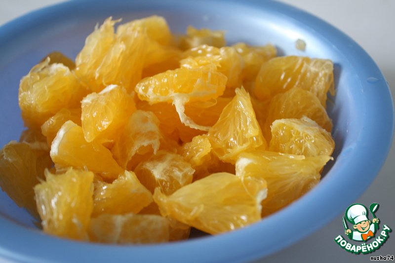 • Апельсин нарезать кусочками.