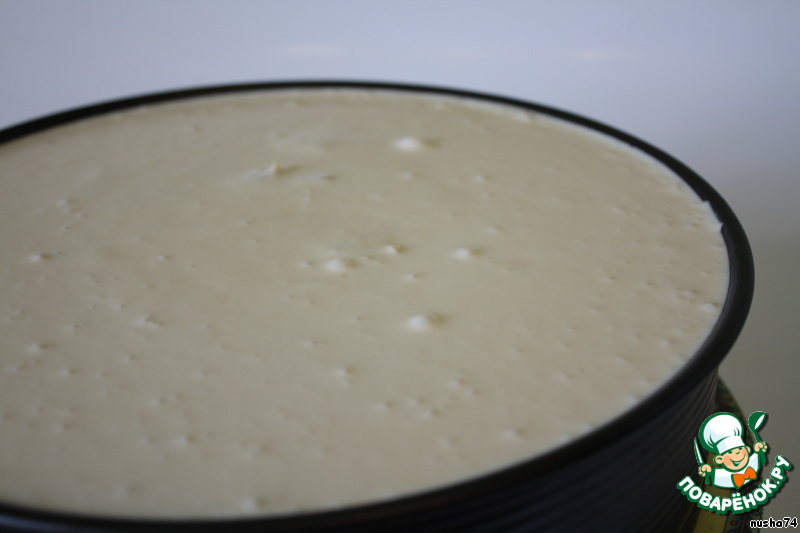 В разъемную форму выложить корж и наполнить ее кремом (когда вся масса была вылита в форму, корж у меня всплыл, и поэтому оказался посередине суфле).