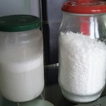 Можно натереть на мелкой терке или воспользоваться измельчителем. На терке стружка получается красивая и ровная. Если стружка вам нужна не для украшения, а для выпечки, то закиньте кусочки кокоса в измельчитель и не парьтесь с теркой. На фото стружка слева - измельчена при помощи блендера, справа - теркой.