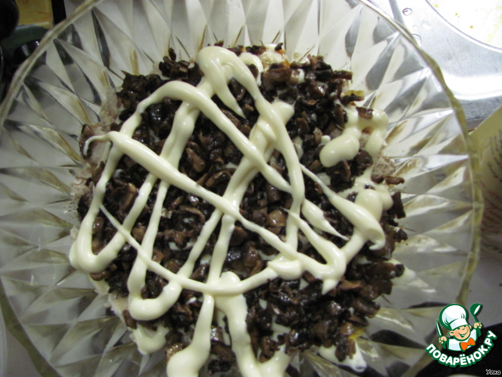 Лук и морковь режем кубиком и жарим на подсолнечном масле, грибы жарим отдельно; в глубокую салатницу выкладываем жареные грибы, поливаем майонезом, на грибы помещаем морковь с луком, солим, перчим и поливаем майонезом.