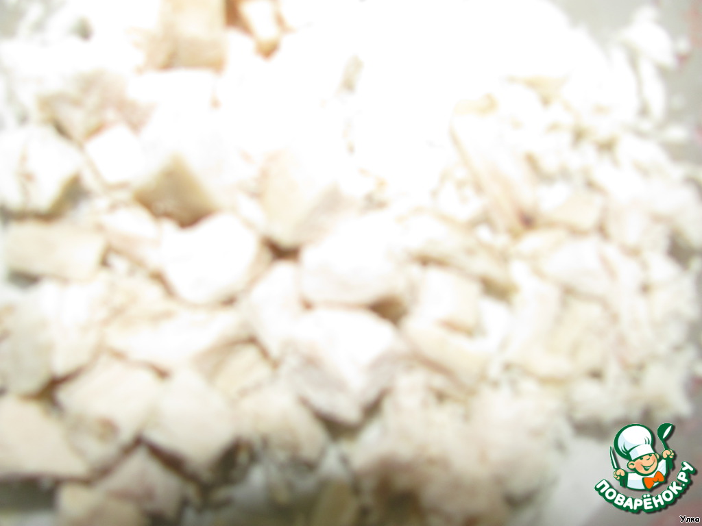 Помещаем нарезанное кубиком отварное куриное мясо, солим, перчим, поливаем майонезом.
