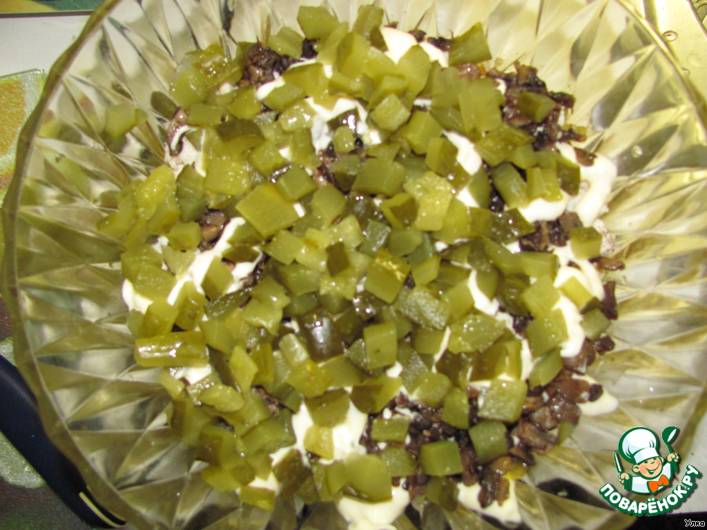 Высыпаем банку кукурузы, предварительно слив с нее воду, солим, перчим, поливаем майонезом, сверху выкладываем нарезанные кубиком маринованные огурцы, поливаем майонезом.