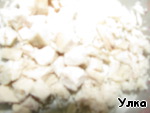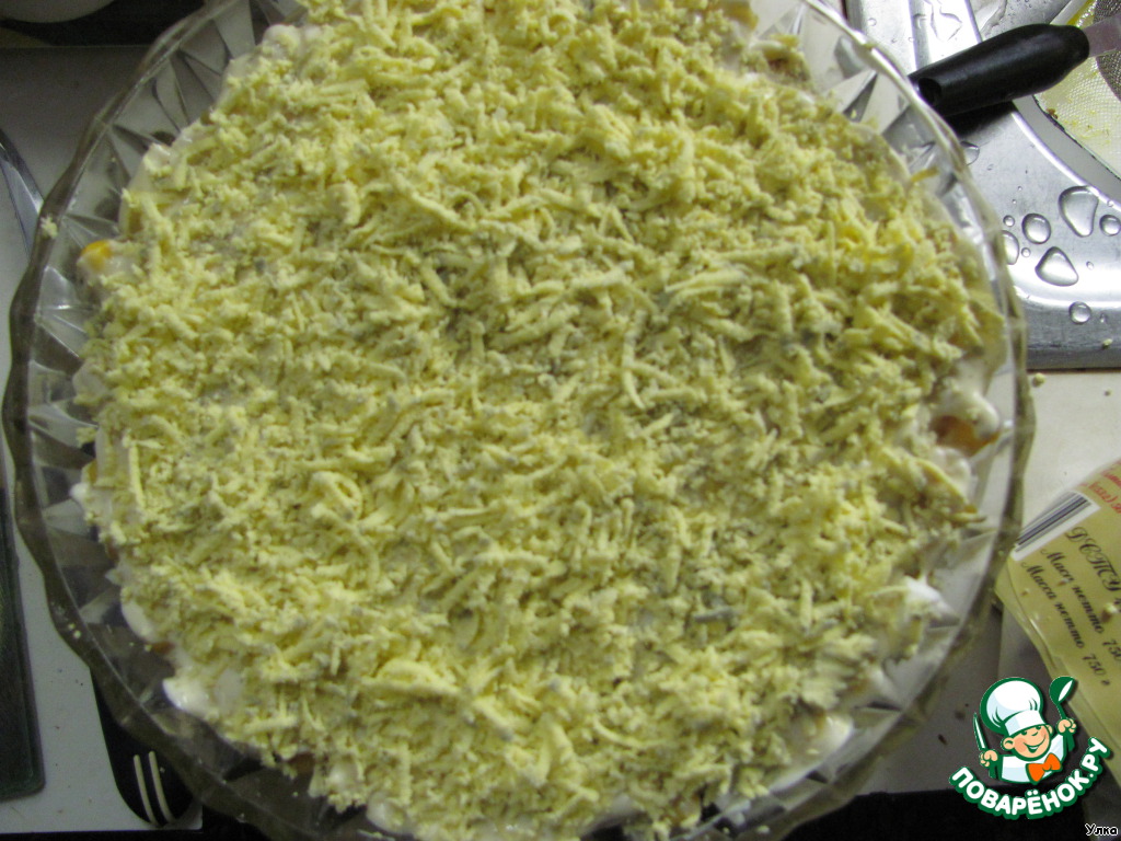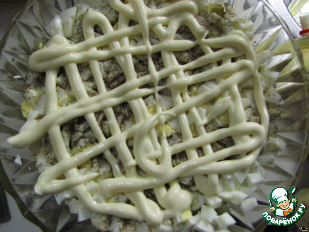 Сверху выкладываем нарезанные кубиком или натертые на терки отварные яйца, поливаем майонезом, солим, перчим, я украшала тертым желтком.