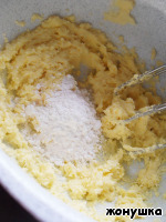 Муку просеять с содой. Мягкое масло взбить с сахаром, добавить сухую смесь пудинга. Вбить яйца и всыпать ванильный сахар, все хорошо взбить.