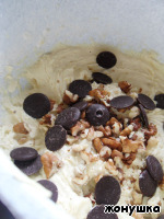 Влить коньяк и сметану, перемешать. Полученную массу соединить с мучной смесью. Добавить орехи и шоколадные капельки.