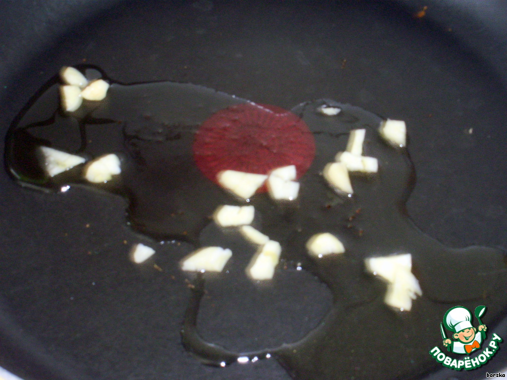 • На сковороде подогреть растительное/оливковое масло и добавить крупно нарезанный зубчик чеснока (не зажаривать!).