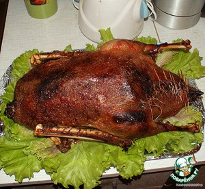 Противень выкладываем фольгой с тем расчетом, чтобы края хорошо прикрывали гуся и в то же время легко открывались при приготовлении. Такая "шуба" поможет вам не прыгать около птички, поливая ее жиром и прочим, гусь хорошо пропечется, никакой гусятницы не надо :)
