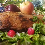 Начинку переложите на блюдо, разделайте тушку на необходимое количество кусочков. Уложите мясо на капусту с яблоками, украсьте свежей зеленью и подавайте к столу.