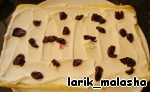 Когда корж остынет, развернуть рулет, смазать кремом (немного оставить на украшение), сверху уложить вишню. -