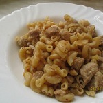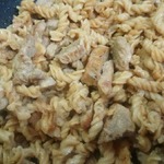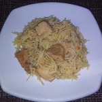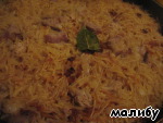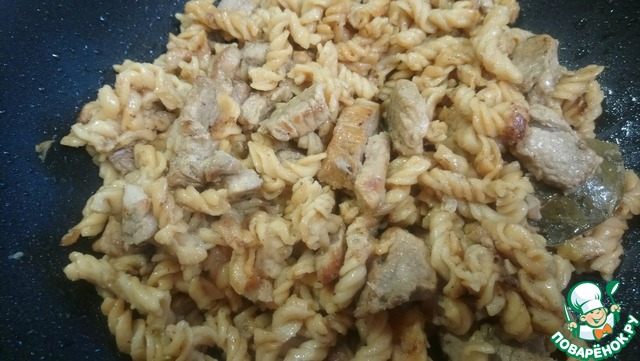 Насыпать вермишель с верху лука и свинины, Перемешать и жарить до светло-коричневого цвета.