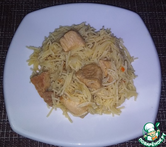 Долить в сковородку кипятка, чтобы он покрывал содержимое. Поперчить, посолить и добавить лавровый лист. Накрыть крышкой и варить, не мешая, на медленном огне до выпаривания жидкости. Выключить когда вермишель немного обжарится. Перемешать и еще немного прогреть.