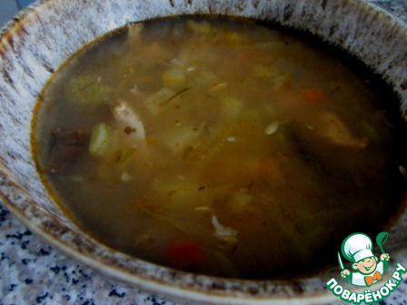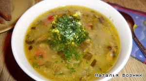 Бывали ли вы когда-нибудь на украинских свадьбах, чтоб со всеми традициями.. в селе.. и не в кафе или ресторане... а в шалаше... Причем тут свадьба? - спросите... А вот именно на такой свадьбе, только уже на второй день (гуляют и празднуют там не один день) я и попробовала первый раз этот самый "годзь", его наверно и варят специально, чтоб после бурных гуляний и принятых градусов, немного облегчить утреннее состояние, поскольку празднования предстоят длительные... ) Для таких свадеб специально строят отдельно кухню-шалашик, при помощи глины сооружают печь, созывают самых знатных кухарок села и наготавливаю вкусностей всяких... ммм-мм. Годзь варят в огромных казанах, на всех гостей))) и он съедается мгновенно))) Я попыталась воспроизвести рецепт приготовления Того Самого "годзя", но в домашних условиях, так как его варят на костном бульоне и часов 8 -10 на печи, то есть "томят" целую ночь, то конечно немного отличается мой рецепт))) Но на вкус - оно самое... и с каждой ложечкой вспоминается те веселые деньки из детства))) А поскольку сейчас еще Великий пост, то я предлагаю постный вариант с грибами, а когда пост закончится можно будет и с мяском на косточках его сварить)))