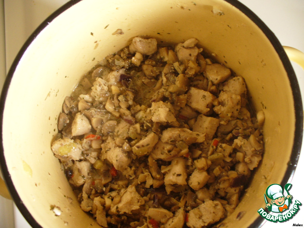Когда филе побелеет, добавить нарезанные шампиньоны. Добавить тимьян, орегано и сушеную зелень петрушки. Перемешать. Накрыть кастрюлю крышкой, тушить 5 -7 минут.