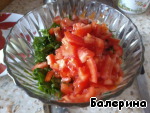• Теперь зелень вашу любимую, я добавила лук зеленый! Помидорки мелко рубим и тоже туда.