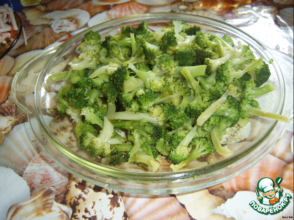 Брокколи отварить так, чтобы стебли сохранили упругость и слегка похрустывали, остудить и нарезать соломкой, или разобрать на соцветия и длинным кусочком стебля.