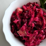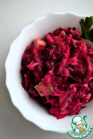 Свёклу заранее отварила в пароварке, оставалось только нарезать/натереть все ингредиенты и смешать