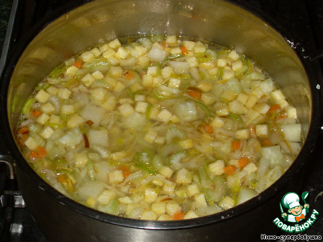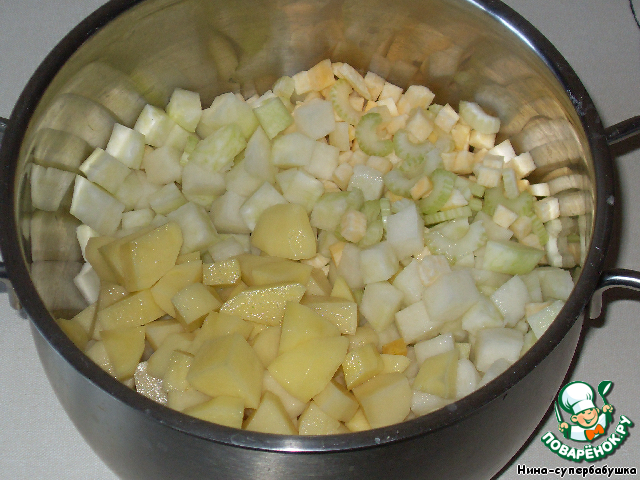 Добавить к ней порей и корневой сельдерей, и все вместе потушить.