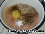 Добавить к фаршу яйцо, крошки, лук и специи - по вкусу.