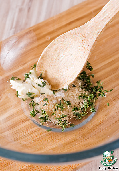 Растереть сливочное масло с сахаром и листочками тимьяна. Добавить сливки комнатной температуры.