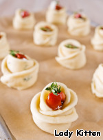 В каждой лепешке сделать три надреза с разных сторон (как показано на фото). По середине положить по кусочку моцареллы и вяленому помидору (или два) и завернуть сначала один лепесток теста вокруг начинки, затем другой и третий (см. фото). Должно получиться что-то типа розы или тюльпана. Украсить веточкой тимьяна.