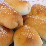 Теперь нам пригодятся те пару ложек яйца, которые мы отобрали. Добавьте к ним немного молока, размешайте. Смажьте рулетики, посыпьте их кунжутом.