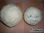 Тесто разделите на две части - 1/3 и 2/3. В 1/3 теста вмешать укроп. Если у Вас сухой, то 1 ч. л. достаточно. У меня на этот раз укроп был замороженный. Я брала 1 ст. л. Тесто отставьте в сторону.