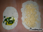 Каждую часть теста разделите на 8 равных частей. Раскатайте полосками. На меньшую укропную часть положите яичную начинку, на большую - сыр. Советую много сыра не сыпать, иначе он может "пролезть" наружу при выпечке.