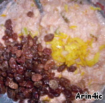 Затем добавьте погашенную уксусом соду, изюм, цукаты, цедру, соль, ванильный сахар.