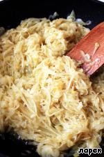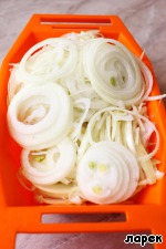 Начинать лучше всего с лука, поскольку подготовка начинки длительный процесс. Я обрыдалась, пока очистила и нашинковала лук. Ну, ничего - это даже полезно. Итак, очистить килограмм лука и нашинковать его тонкими полукольцами. Лучше всего воспользоваться теркой Бернера и другими подобными приспособлениями, поскольку кольца лука, повторюсь, должны быть нарезаны очень тонко.