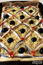 На тесто выложить слой лука, сверху сделать сеточку из анчоусов. В центр каждой ячейки положить по маслинке.