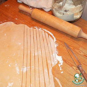 Раскатываем тесто в пласт толщиной миллиметр-полтора, подсушиваем минут десять и режем любыми квадратиками, полосочками, ромашками и пр.