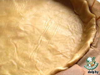 Духовку разогрейте до 180 гр. Тесто раскатайте по диаметру формы (у меня 24 см) и выложите основу с бортиками. Проколите в нескольких местах вилкой, накройте фольгой или бумагой для выпечки, положите сверху какой-то груз (например, фасоль) и поставьте в духовку на 10-15 минут. Затем удалите груз и бумагу и запекайте еще 10-15 минут до светло-золотистого цвета.