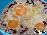 Переложите в миску. Добавьте молоко и 3 яйца. Взбейте, чтобы яйца хорошо смешались с молоком.