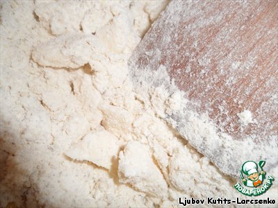 В полученную смесь добавляем холодное сливочное масло и рубим ножом (или, как я, деревянной лопаткой) до состояния мелкой крошки.