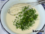 Приготовить тесто на блинчики: взбить яйца, сыворотку (молоко), муку, щепотку соли. Добавить мелко нарезанную зелень.
