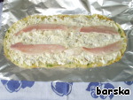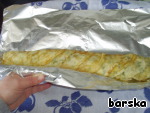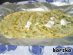 Блинчики выложить на фольгу внахлёст. Смазать сырной массой.