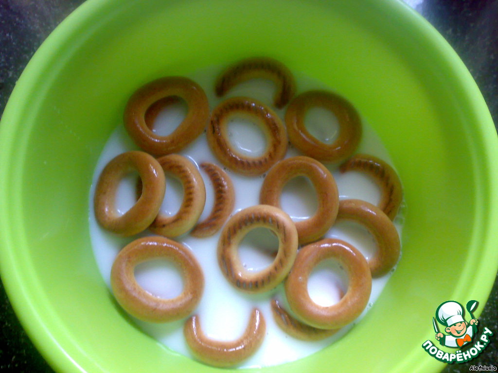 Замочить сушки в молоке до мягкости, но не дать сильно размокнуть. Время зависит от качества сушек.