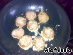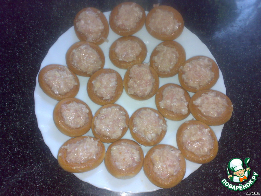 В фарш добавить тертый лук, соль, перец. Размоченные сушки начинить фаршем, придавливая с 2-х сторон, чтобы были немного плоскими.