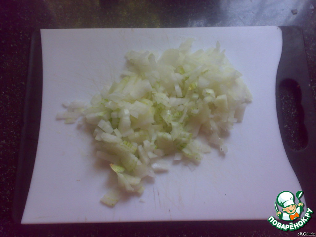 • Фасоль замочить, а затем отварить до готовности. Но можно и консервированную, я делала из такой. Лук нарезать мелкими кубиками. И обжарить до золотистого цвета.