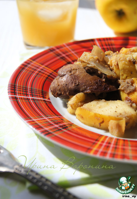 Нежная куриная печeночка с кисло-сладкими яблочками. Быстрое в приготовлении, вкусное блюдо. Рецепт этого блюда был размещeн на сайте в 2008 году пользователем Lesi под названием "Куриная печень с яблоками" и иллюстрирован мной в рамках акции "Раскраски".