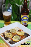 Форму для СВЧ смазать растительным маслом, выложить рыбу, добавить изюм, лимон (или лимонную цедру) и полить пивом.