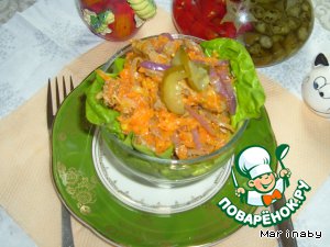 Рецепт этого блюда был размещeн на сайте в 2007 году пользователем Марина под названием "Салат мясной" и иллюстрирован мной в рамках акции "Раскраски". Салат получается нежным и сытным!