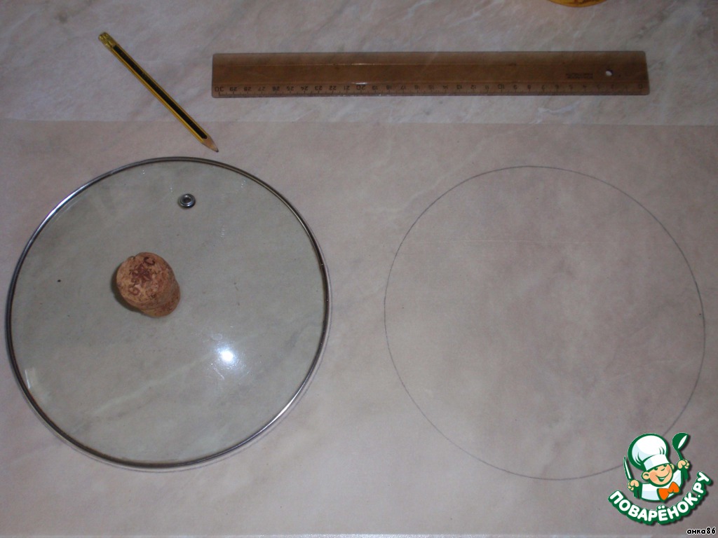 Включить духовку на 100 градусов. Нарисовать на пергаментной бумаге 3 круга диаметром 20 см. Разрезать пергамент на 3 части и промазать круги маслом.