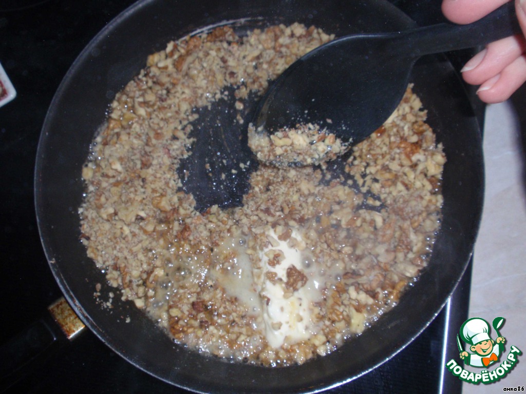 Для приготовления кроканта сварить на сковородке из сахара светло-коричневую карамель, добавить сливочное масло и орехи. Обжарить орехи на небольшом огне до появления запаха.