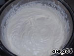 Взбиваем белки, добавляя по ложке половину сахарной пудры. Вводим уксус, продолжая взбивать. Добавляем оставшуюся пудру и взбиваем белки в густую пену.