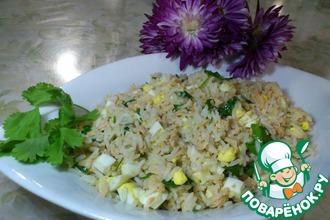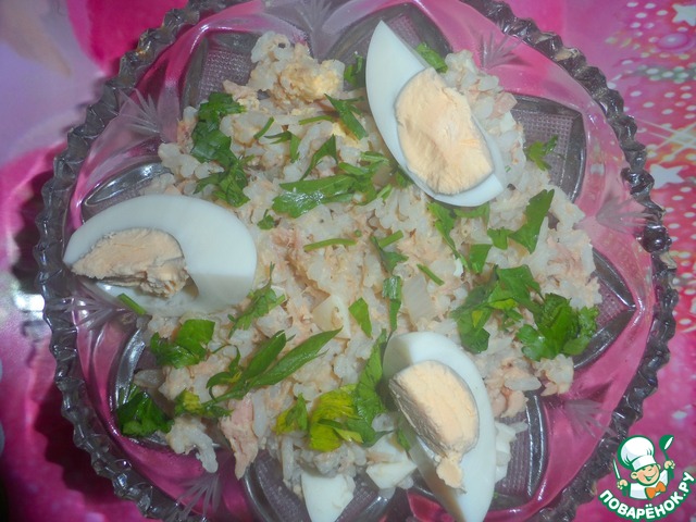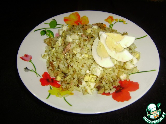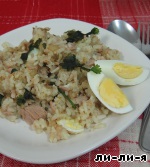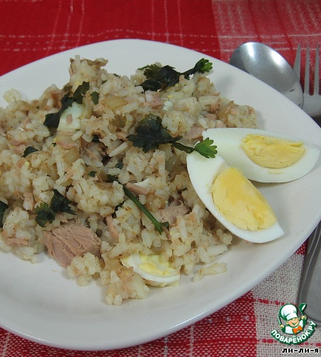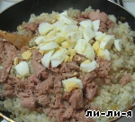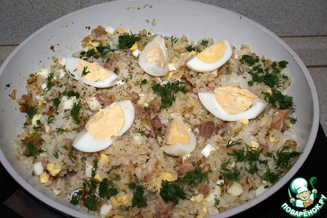 Добавляем к луку рис, рыбу и яйца. Посолить и поперчить по вкусу.