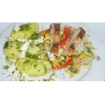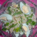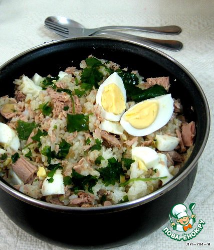 Во-вторых, я использовала замороженное филе тунца (а не консерву), готовила его в мультиварке поставив на режим "варка на пару", предварительно поперчив и чуть-чуть посолив кусочки.