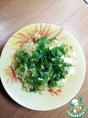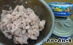 Готовый тунец я порезала мелко и добавила к общей массе в сковородку.