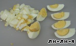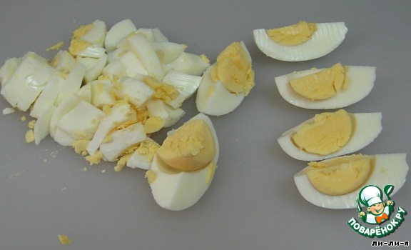 Яйца отварить. Половину нарезаем мелко, а вторую половину нарезаем на четвертинки.