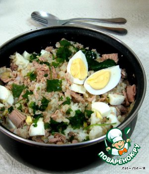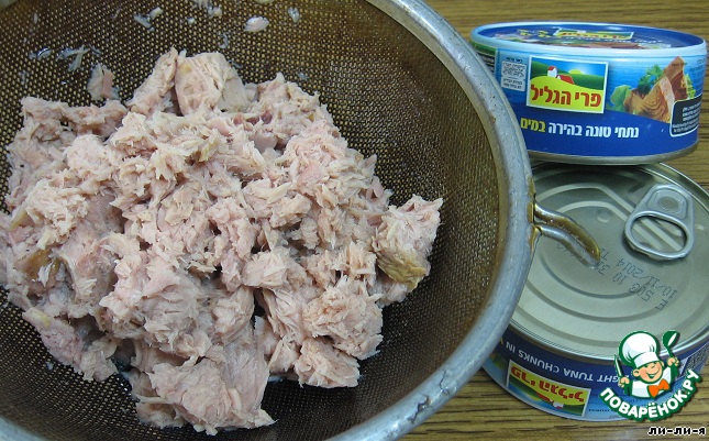 Можно использовать любую вареную не костлявую рыбу (морской окунь или др.). И самый ленивый вариант - рыбные консервы (филе в собственном соку). Рыбу разобрать на кусочки.